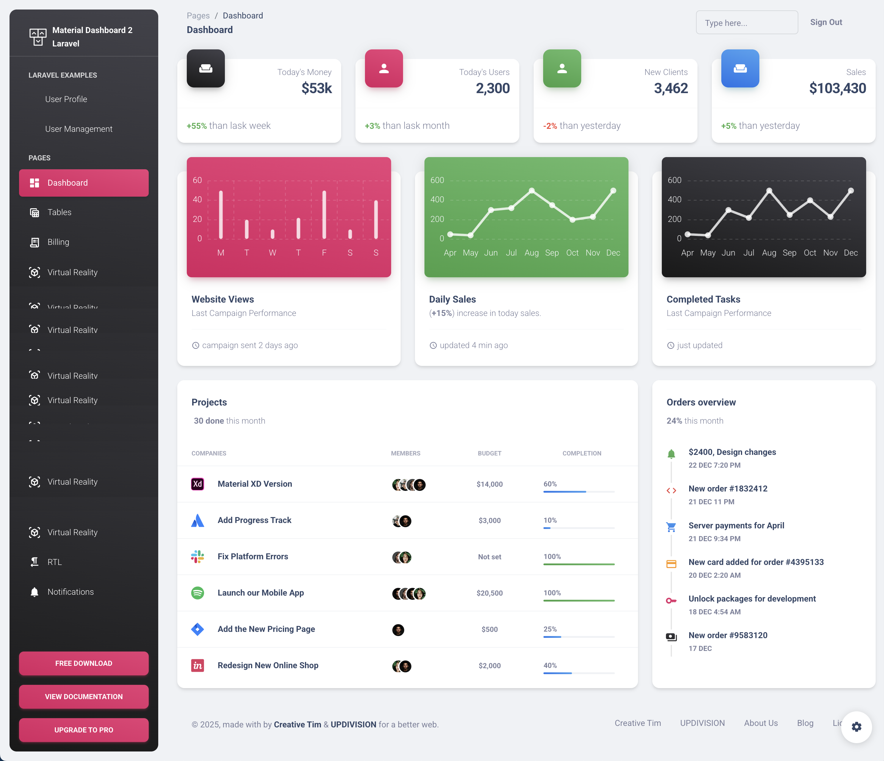 Material Dashboard 2 Laravel is a free full-stack dashboard template combining Laravel backend with Google's Material Design 2 UI. Key features: