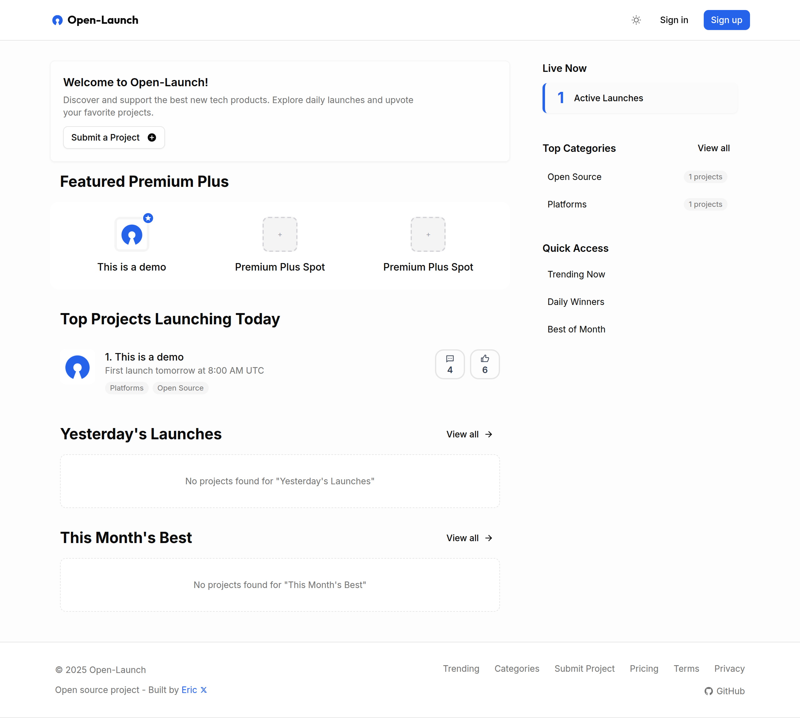 Open-Launch is a comprehensive open-source platform designed as an alternative to Product Hunt, enabling users to discover, share, and vote on new products and projects. It features a modern tech stack including Next.js, React, and TypeScript, along with robust security measures and a user-friendly interface.