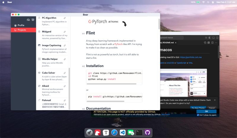 My portfolio website simulating macOS's GUI, developed with React and UnoCSS.
