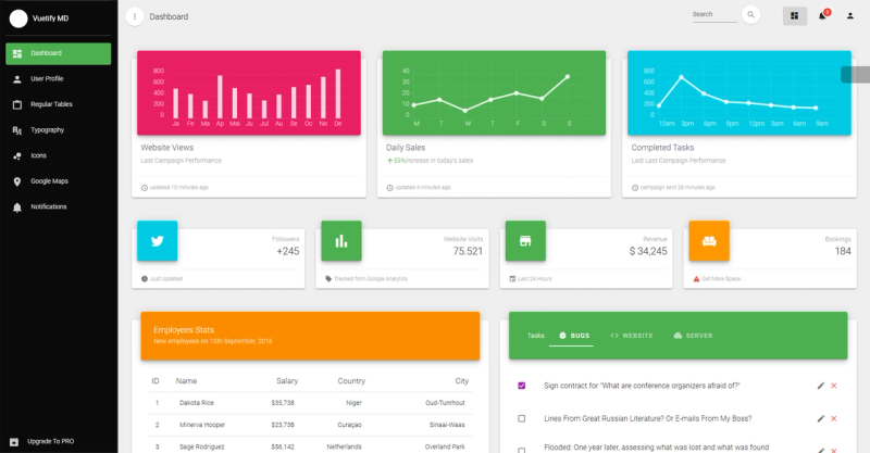 Vuetify Material Dashboard is a beautiful resource built over Vuetify, Vuex and Vuejs. It will help you get started developing dashboards in no time. Vuetify Material Dashboard is the official Vuejs version of the Original Material Dashboard. Using the Dashboard is pretty simple but requires basic knowledge of Javascript, Vuejs and Vue Router.